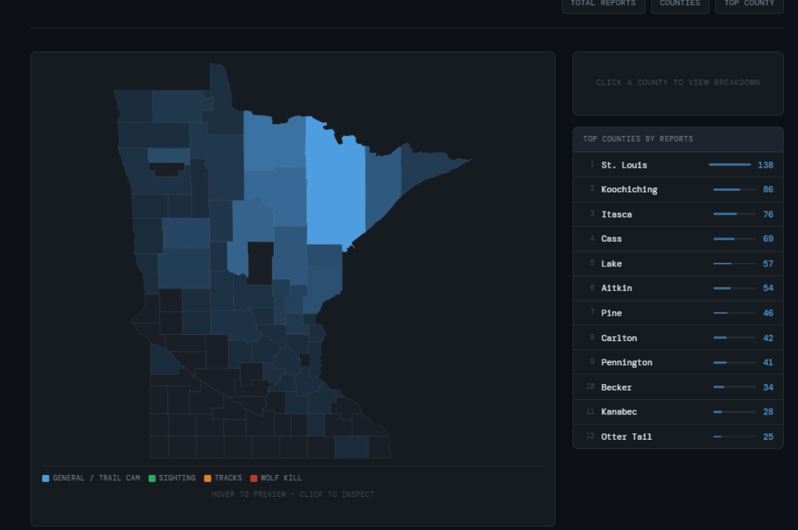 St. Louis County alone accounts for nearly 14% of all reports — not surprising given its size, but also a reflection of dense activity across the Iron Range and BWCA-adjacent forests where wolves have thrived for decades.